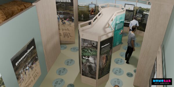 Wat je buiten misschien niet meteen ziet, daar zetten we binnen in de tentoonstelling een spotlight op. Dwars door het ‘landschap’ reis je van de binnenduinrand naar het strand. Onderweg leer je de meest bijzondere planten en dieren kennen.