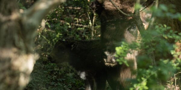 Al een aantal weken was één van de oudere koeien af en aan niet bij de kudde. Gezien de periode van het jaar vermoedden we dat er een kalfje op komst was. En ja hoor! Half mei ontdekte één van de boswachters het kalfje. Het stond verscholen bij moeder in het dichte struikgewas.