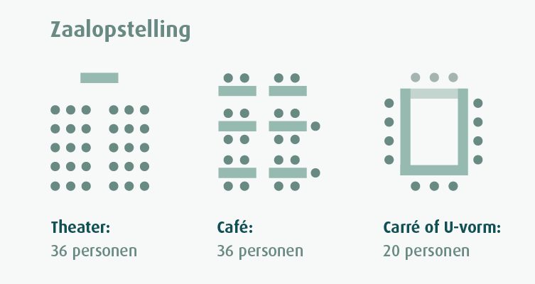 De zaalhuur is gebaseerd op een verblijfsduur van 09.00-17.00 uur (dagprijs) of een dagdeel van 09.00-12.30 of 13.00-17.00 uur. Afwijkende tijden zijn in overleg mogelijk.